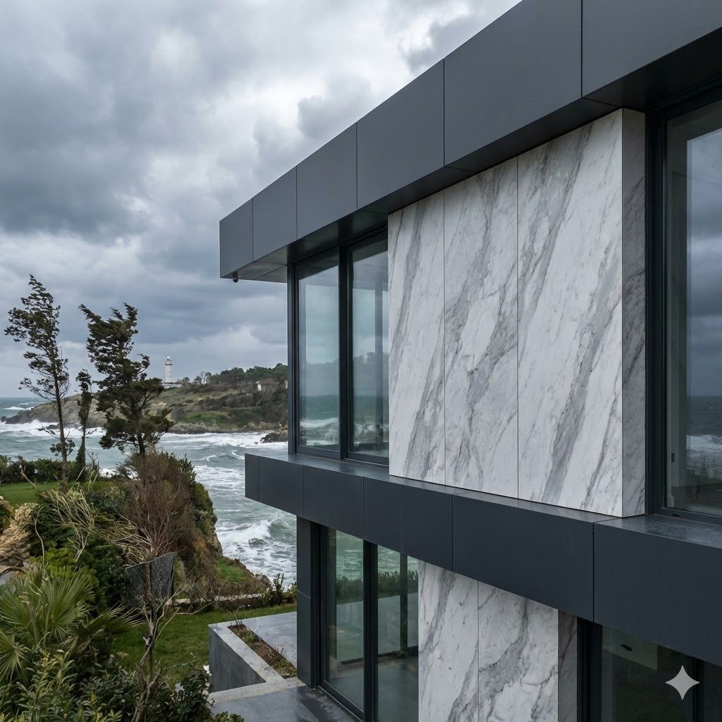 Şile’nin sahil bandındaki yüksek nem ve denizden gelen tuzlu hava, binaların dış yüzeyleri için en zorlayıcı çevresel faktörlerdir. Klasik kaplama malzemeleri zamanla gözenekli yapıları nedeniyle bu tuzu ve nemi içine hapsederken, porselen seramiğin en ileri formu olan Sinterflex, tamamen gözeneksiz yüzeyi ile bu sorunu kökten çözer. Dev boyutlu plakalar sayesinde cephede çok daha az derz (ek yeri) oluşur, bu da su sızdırmazlığını artırırken yapınıza sonsuz bir estetik derinlik katar.